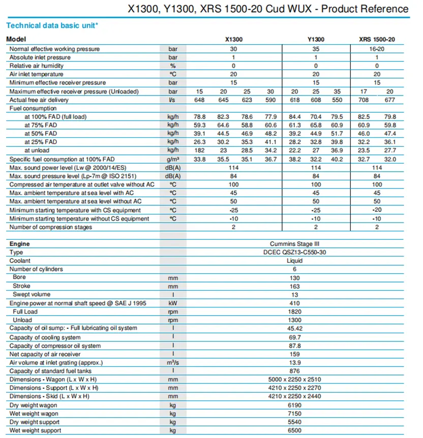 అట్లాస్ కాప్కో X1300, Y1300 మరియు XRS 1500-20 సైలెన్స్డ్, రెండు-దశల, ఆయిల్-ఇంజెక్ట్ చేయబడిన స్క్రూ కంప్రెసర్లు, లిక్విడ్ కూల్డ్, సిక్స్-సిలిండర్ కమ్మిన్స్ డీజిల్ ఇంజన్తో ఆధారితం.