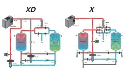 ఇంకా, XD లేదా X కంప్రెషన్ హీట్ డ్రైయర్లు నిజంగా శూన్య-వాయు-వినియోగ డ్రైయర్లు, చల్లగా వీచే దశలో ఎటువంటి శక్తిని లేదా కంప్రెస్డ్ ఎయిర్లో కొంత భాగాన్ని మాత్రమే వినియోగించుకుంటాయి.