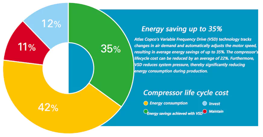 ఆయిల్-ఫ్రీ స్క్రూ ఎయిర్ కంప్రెసర్ యొక్క మొత్తం జీవితచక్ర వ్యయంలో శక్తి వినియోగం 80% కంటే ఎక్కువ. ఇంకా, కంప్రెస్డ్ ఎయిర్ ప్రొడక్షన్లో ఉపయోగించే విద్యుత్తు ఫ్యాక్టరీ మొత్తం విద్యుత్ ఖర్చులో 40% పైగా ఉంటుంది. శక్తి ఖర్చులను తగ్గించడానికి, అట్లాస్ కాప్కో కంప్రెస్డ్ ఎయిర్ పరిశ్రమలో వేరియబుల్ ఫ్రీక్వెన్సీ డ్రైవ్ (VSD) సాంకేతికతను ప్రారంభించింది. VSD గణనీయమైన మొత్తంలో శక్తిని ఆదా చేయడమే కాకుండా భవిష్యత్ తరాలకు పర్యావరణాన్ని కూడా రక్షిస్తుంది. ఈ సాంకేతికతలో నిరంతర పెట్టుబడికి ధన్యవాదాలు, అట్లాస్ కాప్కో మార్కెట్లో విస్తృత శ్రేణి ఇంటిగ్రేటెడ్ VSD కంప్రెసర్లను అందించగలదు.