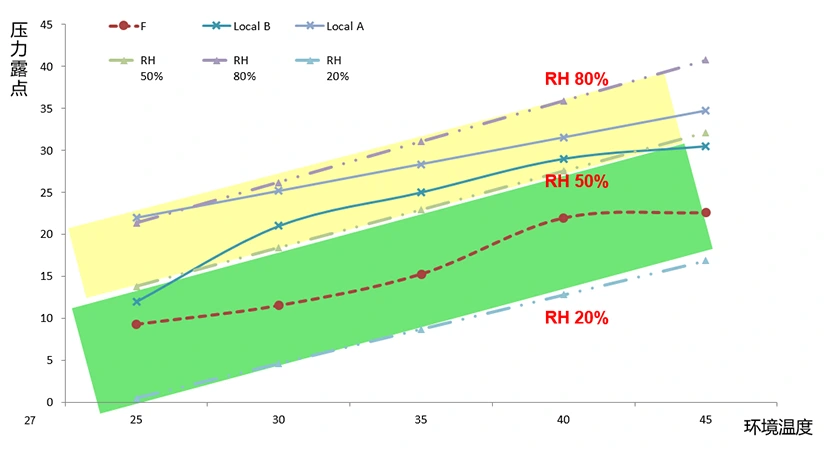దిగువన కొలిచిన డేటాలో చూపినట్లుగా, 7 బార్ యొక్క కంప్రెస్డ్ ఎయిర్ ఇన్లెట్ ప్రెజర్, 35 ° C యొక్క ఇన్లెట్ ఉష్ణోగ్రత, 7 ° C యొక్క ప్రెజర్ డ్యూ పాయింట్ మరియు 25 ° C యొక్క చివరి ఎగ్జాస్ట్ ఉష్ణోగ్రతతో, గాలి యొక్క సాపేక్ష ఆర్ద్రత 30%, పైప్లైన్లు మరియు గాలిని ఉపయోగించే పరికరాల తుప్పును సమర్థవంతంగా నివారిస్తుంది.