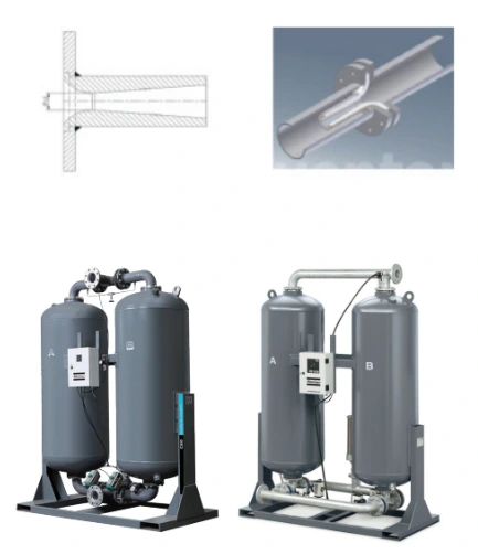 ■ సోనిక్ నాజిల్ ఓవర్ఫ్లో నిరోధించడానికి కొంచెం వేడిచేసిన అడ్సార్ప్షన్ డ్రైయర్ వెనుక భాగంలో ఇన్స్టాల్ చేయబడింది. బహుళ డ్రైయర్లను సమాంతరంగా ఉపయోగించినప్పుడు, ప్రతి డ్రైయర్ యొక్క గాలి పరిమాణం సమానంగా పంపిణీ చేయబడుతుంది.